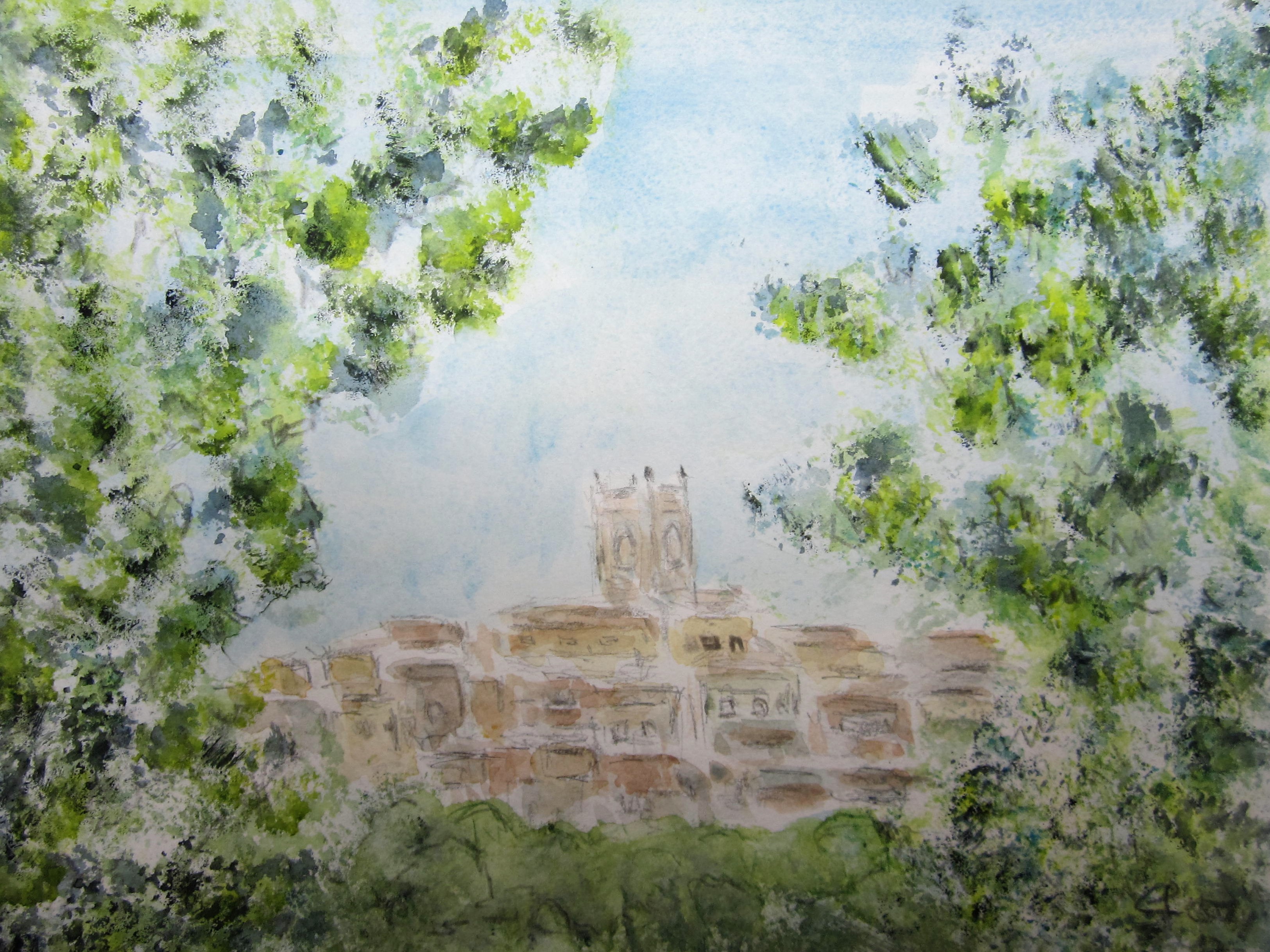 Blick durch die Bäume auf Cola‘ die Lasize Posted 29. Oktober 2017 by Eva Flueck Blick durch die Bäume auf Cola‘ die Lasize Aquarell, 2017 mit Passepartout und Rahmen 40 x 50 cm