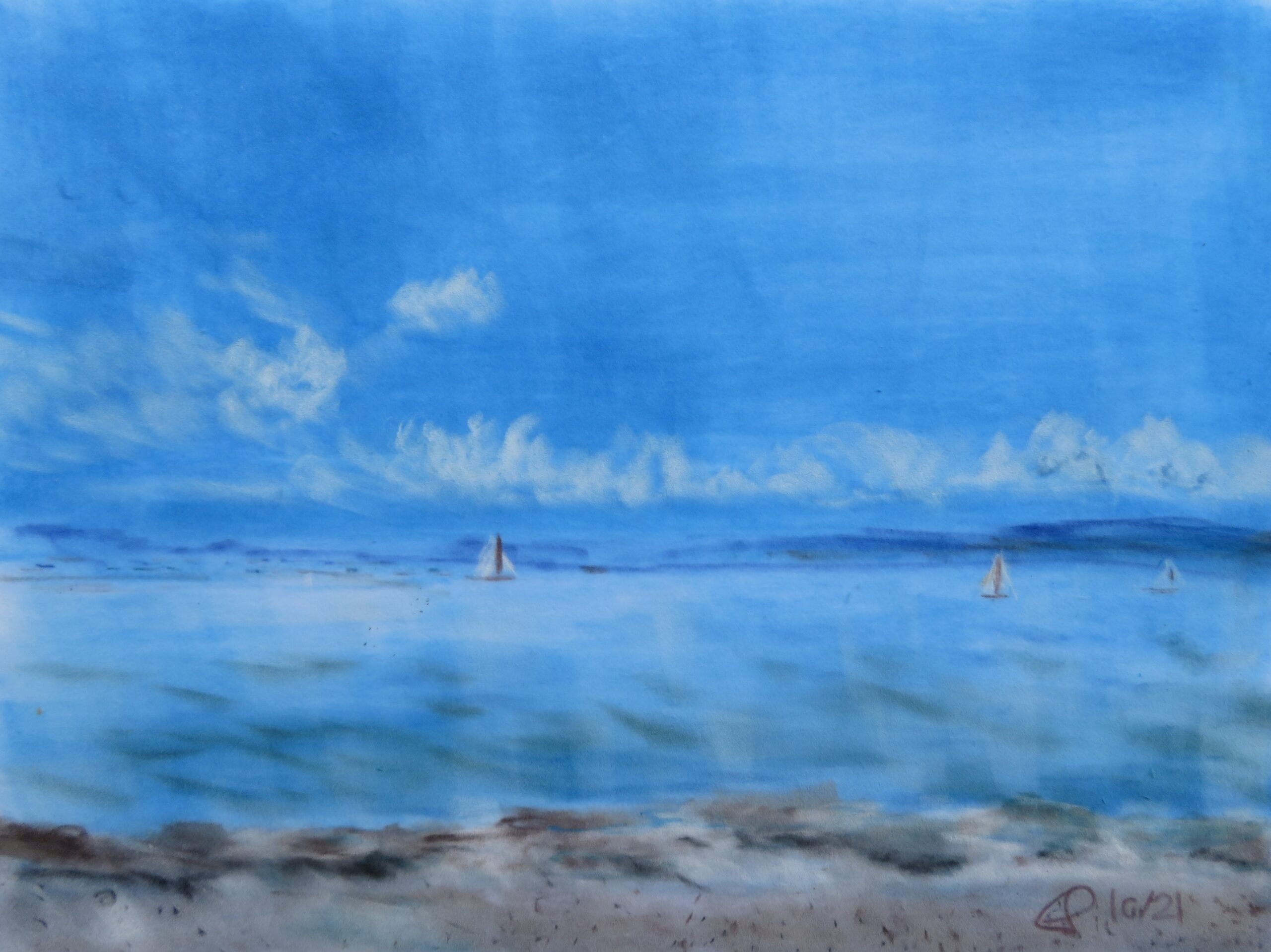 Bodennsee im Hochsommer Posted 1. November 2021 by Eva Flueck Bodensee im Hochsommer, 2021 Weichpastellkreide, mit Passepartout und Rahmen 50 x 70 cm
