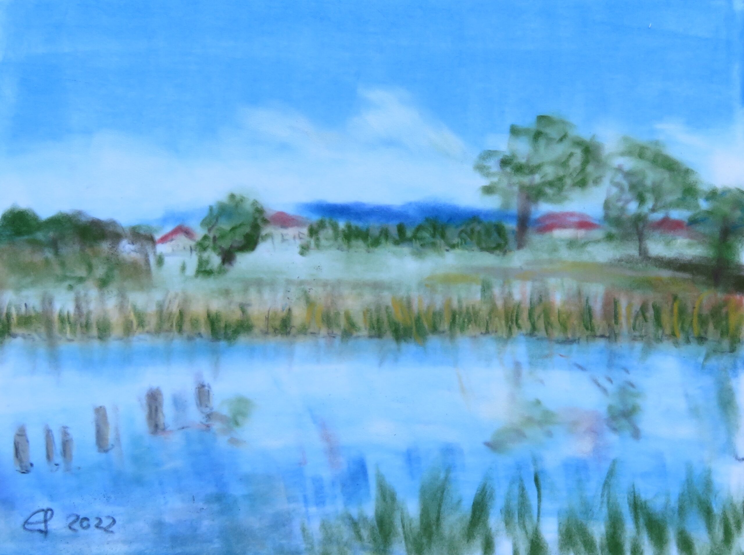 Moorsee im Hochsommer 2022 Posted 20. Juli 2022 by Eva Flueck Moorsee im Hochsommer, 2022 Weichpastellkreide Mit Passepartout und Rahmen, 50 x 70 cm